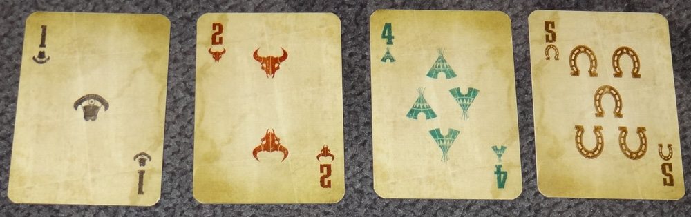 In the prototype the Gunslinger dice are just standard dice, but as you can see on the Kickstarter page, the finished game will have custom bullet-shaped dice. The Poker cards have a weathered look to them, with four custom suits: Cattle, Horseshoes, Teepees, and Hats.