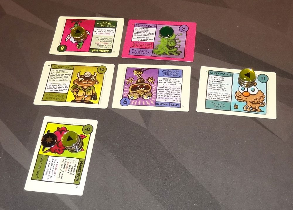 The cards are a lot of fun, with some really cute creatures and some really bizarre ones. Each one has hit points, basic attacks, special abilities, and a battle cry. Some are also members of a group and have a group ability. I really love the cartoony artwork on the cards, and the battle cries are entertaining.