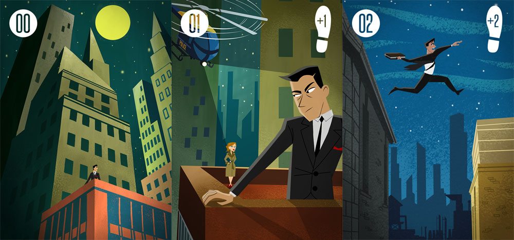 Tim Fowers has always had pretty fun packaging for his games, and this one will have a magnetic clasp box that looks like a briefcase. The artwork, by Ryan Goldsberry, has a cool retro feel to it and matches Burgle Bros. (Both games are set in the same world.) I really love the artwork, and even though you could play the game just with numbered cards, I think the artwork will add some fun flavor to this cat-and-mouse game.