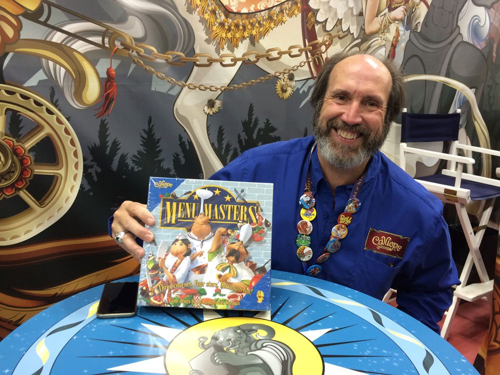 Because so much of this is old hat, I think my favorite bits are the little surprises. Jonathan Liu and I have a long-standing tradition of stopping by Calliope Games to see Ray Wehr, the owner. Calliope has some great games, like Tsuro and Roll for It, but Ray wanted to talk about the pending release of the first “Titans of Gaming” titles, which were Kickstarted last year. The first three, Running with the Bulls by Paul Peterson, Hive Mind by Richard Garfield, and Menu Masters by Jordan and Zach Weisman, will be showing up on doorsteps very soon. I knew they were going to be good, but the production on these three games blew me away. They were gorgeous and fun to look at – the detail in Running with the Bulls will keep you occupied for quite a while – and, best of all, fun to play. If you backed the Titan Series, you’re going to be very happy. If you didn’t, keep an eye on your local game store. Each will be available for just $30.