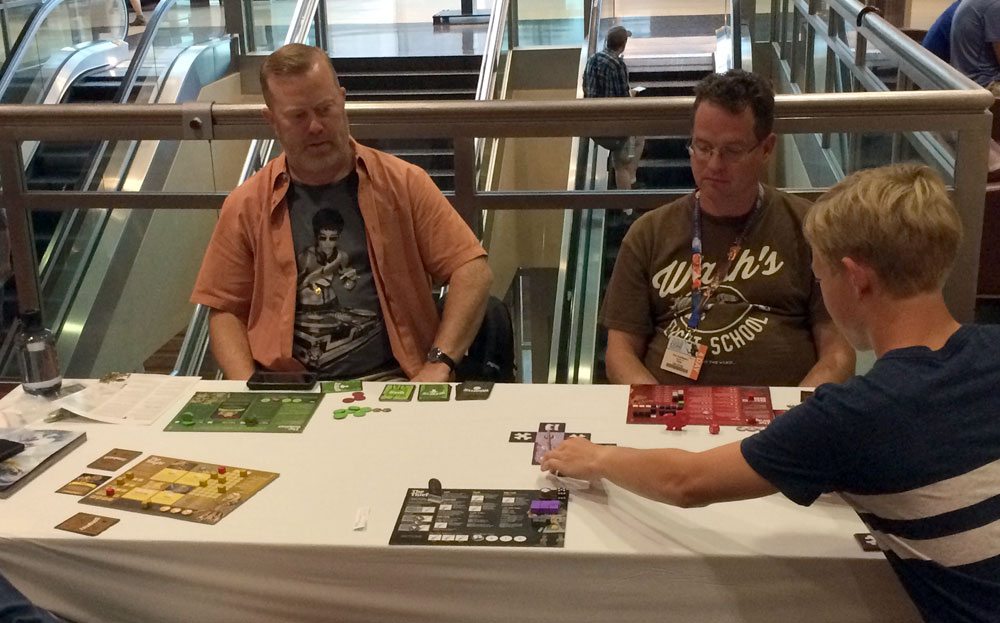 I could go on and on about all the games I played and enjoyed (and I will, soon), but a couple of highlights that stood out. Covert is an upcoming spy-themed game by Kane Klenko, who also designed Fuse and Dead Men Tell No Tales. You move around Europe, picking up devices and getting to particular locations in order to fulfill missions, plus there’s a code-cracking option to unlock additional equipment.