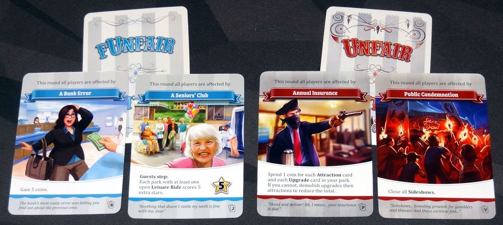 The one downside to the themes is that setting up and putting Unfair away can take a little longer. Each card has a little icon in the bottom left corner so you can sort them out by theme. But then, either when you put it away or when you set it up, you’ll have to take each theme, separate it into the different types of cards (Park, Event, City Event, Blueprint, etc.) and shuffle them together. It can take some time to do, and there’s no easy way around it.