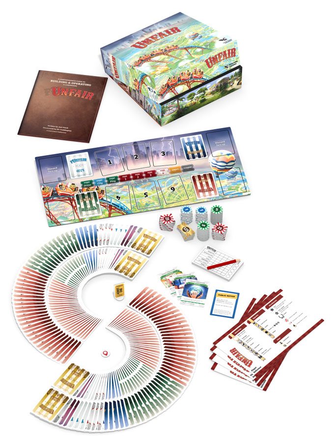 At a glance: Unfair is a game by Joel Finch for 2 to 4* players, ages 12 and up, and takes about 25 minutes per player. It’s already funded on Kickstarter and has been hitting stretch goals, with a pledge of $49 for a copy of the game plus stretch goals. (Special note to our Aussie readers: Good Games Publishing is based in Australia, so they’re offering free shipping to Australia and New Zealand!) The game has a lot of “take-that,” plus some fairly cynical humor about theme parks; the age rating seems about appropriate to me based on the thematic content, somewhat vicious player interaction, and resource management.
