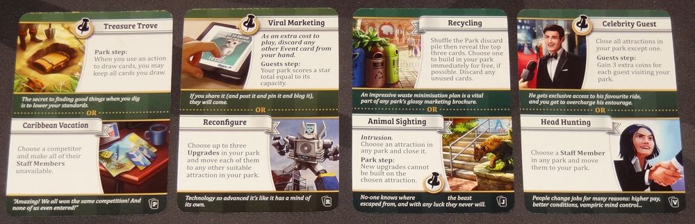 I really like the way the themes work: each theme has its own mix of events, attractions, and effects. For instance, the Jungle theme is all about the leisure rides, and focuses on expanding your park capacity. The Robot theme is all about upgrades: there are many effects that let you build upgrades for free. There are some events that are common across multiple themes, but each theme also has some that are specific to it. Becoming familiar with the various themes and which types of events are in each deck could also direct your strategy somewhat, though that certainly gets into more advanced play.