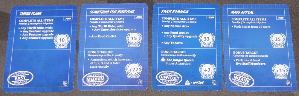 To score, you consult the chart for your attraction size: each icon in the attraction’s ribbon will increase its score. You get points for Staff Members in your park, as shown on the cards. Reveal your Blueprints: you score points if you completed the Required section on them, but lose points if you don’t. Some Blueprints also include a Bonus section, which can award more points if the Required section was completed. You also get 1 point for every 2 coins you have at the end of the game. Finally, deduct any points required for loans.