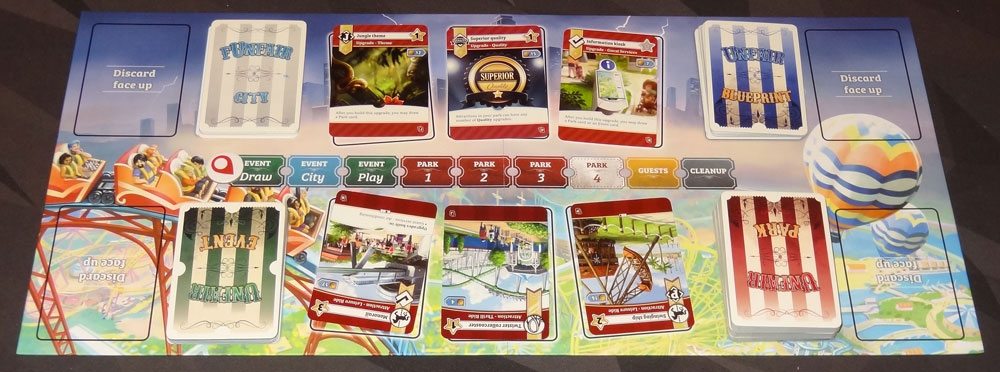 To set up, you’ll include one theme pack per player (some recommendations are listed in the rulebook), and then shuffle together the cards of each type to form decks. (For instance, take all the Park cards from the selected themes and combine them into one Park deck.) The Park, Event, and Blueprint cards go onto the appropriate spaces on the board. The City Event deck has a special setup: it will be 4 “Unfair” cards, then the City Planning Closure card, and then 4 “Funfair” cards on top of that. (Any other Unfair and Funfair cards are set aside without revealing them.)