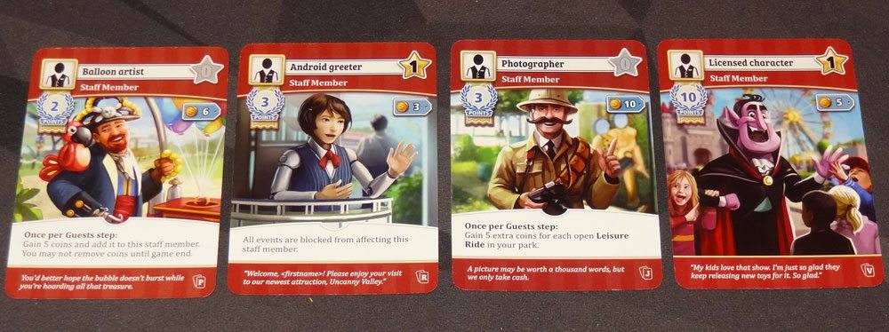 The artwork on the game is primarily by Mr. Cuddington, with additional illustrations by Philippe Poirer, and I really love it. It’s mostly realistic (particularly the theme park attractions) but there are also nice little touches of humor. Most of the cards also have flavor text on them, which is incidental to the game but really adds a lot of humor. Even the rulebook itself is pretty funny—it’s made to look like somebody went through it with a blue pen and scribbled their own notes and doodled on people’s faces.