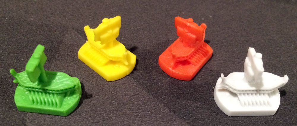 The components for this are nice: the cardboard tiles are all nice and sturdy, and the plastic ship pawns are fun. The Storm tiles and the Sea Monster tiles are all larger squares, and other special tiles and reminder tokens are all small squares, made to fit within the grid spaces printed on the map boards.