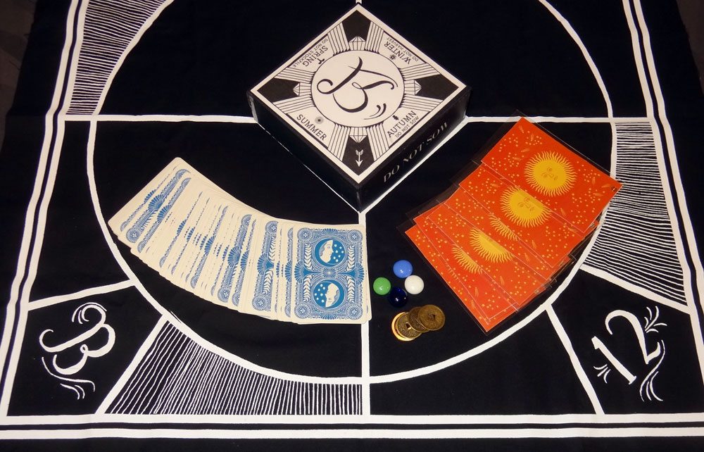 I first saw a prototype of Illimat last December. Many of the elements were already there: the board and box, the season-based suits, the three primary actions. However, the game and the look have gotten a lot of tweaks and adjustments since then, and it’s pretty polished. Keith Baker and Jenn Ellis of Twogether Studios ran demos of it at PAX West in Seattle and XOXO in Portland this fall and have gotten a pretty good reception.