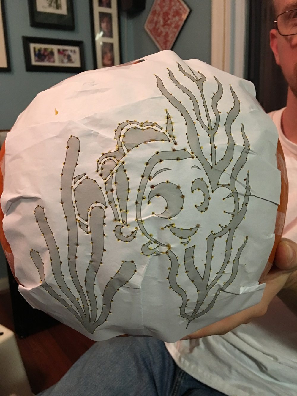 - Step 4: Spend an inordinate amount of time connecting the dots and retracing the design on the pumpkin. (Bonus points for feeling like an idiot.)