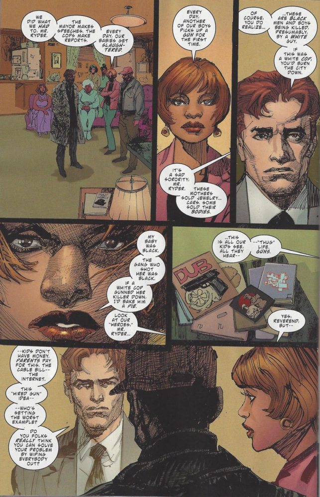 Ray: Maybe the best issue of the series and the best comic Priest has written since his Black Panther run twenty years ago, this done-in-one story taking place in gun-plagued Chicago isn’t a Deathstroke story, not really. It’s a story about a plague of killings, and a group of mothers so desperate to stop it that they make a literal deal with the devil. It starts with another tragic gun death – a young bystander shot dead by a woman trying to defend herself from rapists. Or is he a drug mule killed in a misunderstanding when his buyer panicked? Either way, one more body, and now some people have had enough. As a policeman and a reverend try to make sense of the chaos, a group of bereaved mothers have apparently hired Deathstroke to wipe out the gangs that are killing their children.