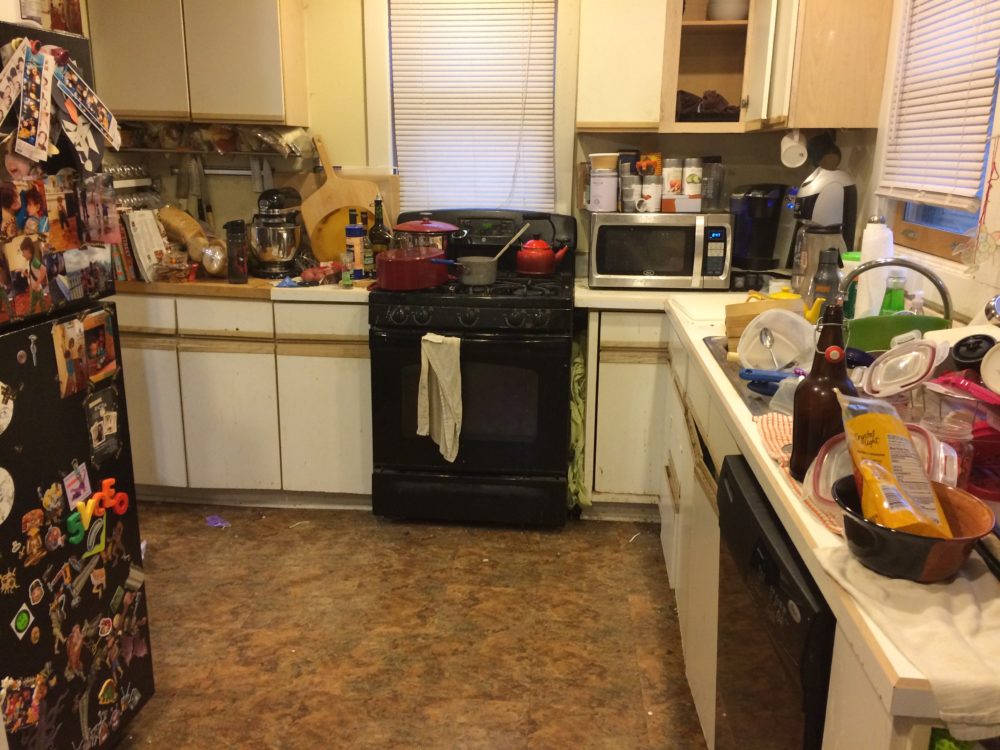 The terrible kitchen you see in that picture? That’s my terrible kitchen. We live in a turn of the century rental we thought was charming four years ago and which we’re now extremely glad we don’t own. We’re grateful the washer and dryer aren’t in our creepy basement but they do take up a third of the room. We have no pantry to speak of. Our dishwasher leaks and I have to run bleach through it periodically to get rid of the mold. Our oven door is held together with a zip tie because the handle broke a year ago and the landlord hasn’t fixed it yet. The cabinets are peeling, the floor is ugly as hell, and there’s only so much I can do to clean the place or make it look any better.