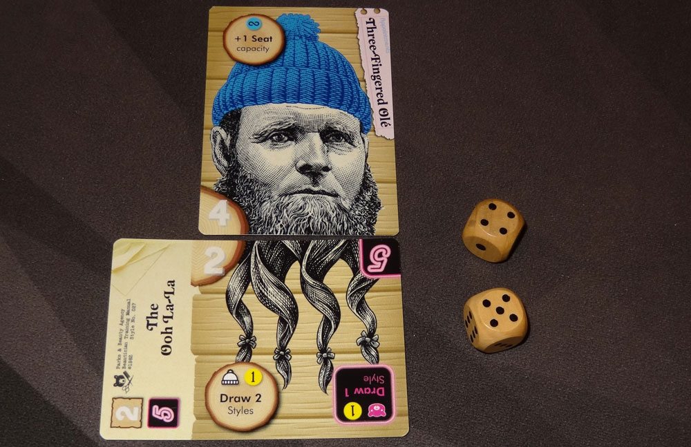 The gameplay itself is fairly simple to teach—draw a style card, get a new client, or attempt to style your client. But within that simple structure and the humor there’s still room for some strategic decisions. For instance: when choosing clients and styles, do you go for lower combinations so you’re more likely to succeed with your dice roll, or do you pair high-value clients with high-value styles in the hopes of scoring big? The styles have complementary values depending on whether they’re beards or hairdos, so you have a little bit of control over how difficult your dice roll will be.