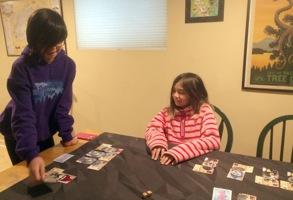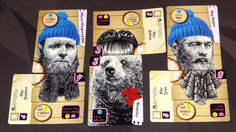 And then, of course, there’s the talking to the cards. It’s another rule that increases the silliness factor, because of course talking to your card has no real mechanical effect—you get one chance to reroll the dice. But it is a lot of fun to hear what players will say to a lumberjack or a bear so that they’ll accept a particular style, and since each claim has to be unique, you start getting quite bizarre once several people have failed rolls. My oldest daughter was disappointed during one game because she kept succeeding at her initial rolls—she really wanted a chance to talk to her clients about their choices. It’s also fun to imagine the bears and lumberjacks chatting with each other in the salon and commenting on their hairstyles and beard fashions.