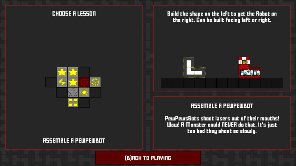 You select a block from the top of the screen, rotate it to whatever orientation you want, and then drop it—it will fall straight down until it lands on something. If you arrange the blocks to match one of the assembly instructions, it turns into that bot. However, most of the bots don’t do anything unless they’re powered—that little “plug” icon on the PewPewBot means it needs one BatteryBot. So you’ll need to make a DwellingBot, and then connect it with paths to that plug, so that the BatteryBots can travel there and activate the bot.