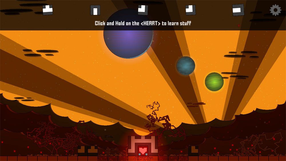 To rescue the Heart, you’ll have to survive a set number of nights, and each Heart increases the duration for the next planet in the solar system. If anything gets through to the Heart—monsters, lava, dust storms, etc.—then it will eventually take too much damage and perish. There isn’t any sort of health meter so you don’t know exactly how many hits it will take, but the heart yelps and the edges of the screen flash red each time it gets hurt, so it’s kind of flinch-inducing when it happens.