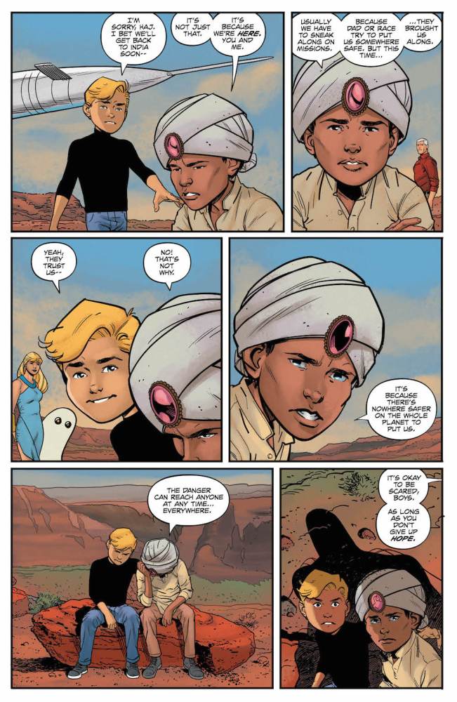 The government, reacting level-headed as always, has ordered the rounding-up of all alien heroes. The remaining alien heroes who have escaped justice include TT cartoon Starfire, as well as some deep-cut heroes like Jemm, Son of Saturn and the blue Starman. Although the government agents chasing them continue to be slightly irksome when they appear, this motley crew of alien heroes provides a lot of fun scenes and even some clever callbacks to past issues of this book. The reveal is a bit predictable if you know your Martian Manhunter lore, but this is overall one of the most enjoyable issues of the series in a while, with another last-second twist that throws the plot for a loop.