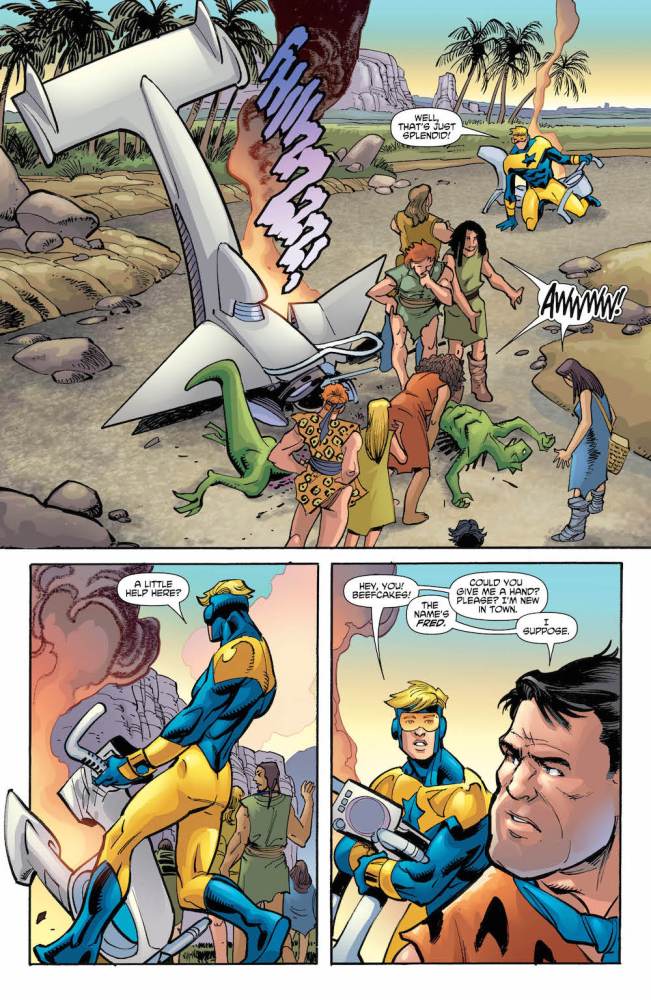 Ray: It’s been a while since we saw Booster Gold, hasn’t it? Since the early years of the New 52. So of all the places for him to make his triumphant return, a Flintstones crossover is both unlikely and yet somehow perfect for this offbeat character. He’s currently hanging out in the year 2472, in a Gotham City that is both very safe and very boring. An alien invasion interrupts his date, and he hops into his timesphere to track the aliens back to when they previously appeared on Earth – which would be in Bedrock twenty-two thousand years ago. He accidentally kills the then-peaceful aliens, which is probably why they attacked Earth later, and seeks out the help of one Fred Flintstone.