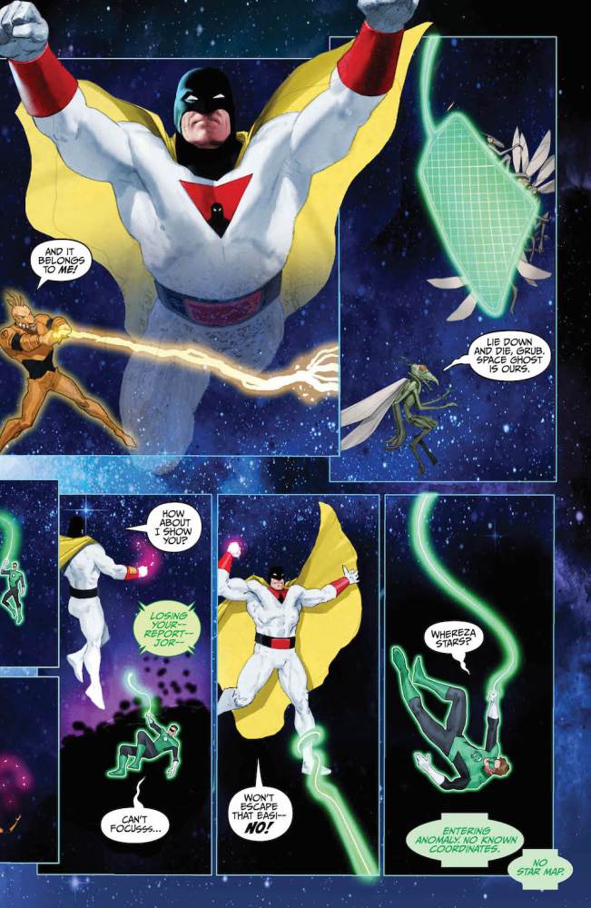 Ray: Unlike the Future Quest/Adam Strange story, this issue doesn’t waste all that long setting up its story. Hal Jordan is off in space on a mission to a far-off sector, where a top-secret powerful weapon is waiting. Larfleeze got there first, and Hal and the crazy Orange Lantern fight – until a mysterious shadowy being takes out Larfleeze and then trains his fire on Hal. Before Hal and Space Ghost can get acquainted and put away their weapons, alien bugs sent by Space Ghost’s arch-nemesis Zorak arrive. The two are still battling as the attack comes, which doesn’t really seem like a good idea, and they soon crash on an alien planet.
