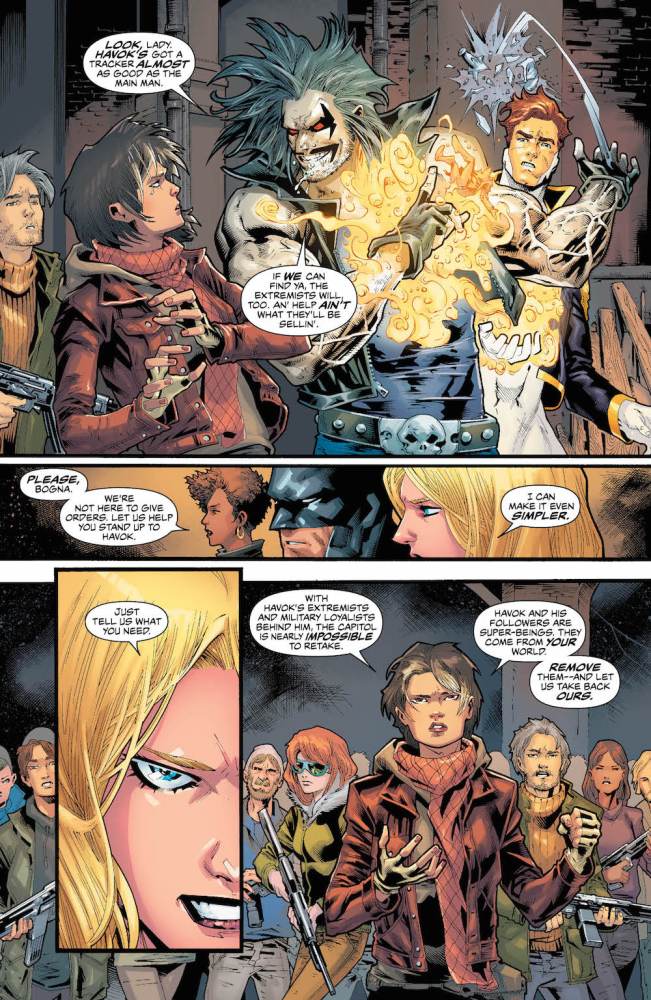 Ray: Coming on the heels of the character-driven one-shots and zero issue, it’s a bit of a surprise that this first arc is a no-holds-barred geopolitical action thriller. However, it works surprisingly well. Lord Havok and the Extremists on the surface seem like generic 90s villains, but Havok has a much different plan in mind. Having taken over a failed state where he ruled in his dimension, he has pacified the citizenry and used force to gain recognition from the world at large. Now he seeks to reassemble his larger empire and begins intimidating surrounding nations, most of them poor and troubled, into surrendering and joining him without ever firing a shot. Although most citizens of Kravia have accepted his rule, there is still a resistance, led by a young revolutionary, Bogna Budusheva. That’s where the JLA comes in.