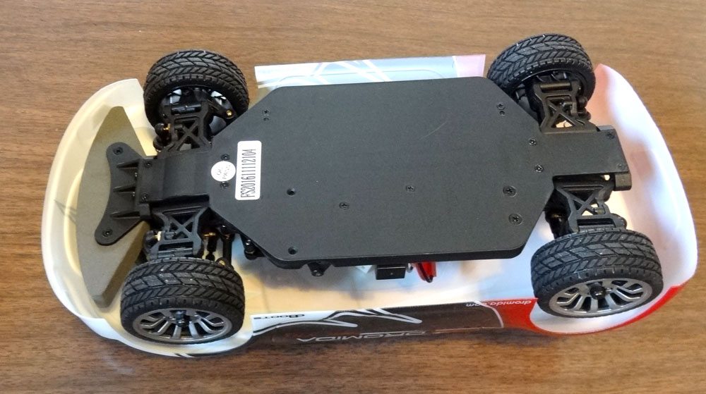 First, the specs: the Dromida Touring Car retails for $109.99 and is available directly from the Dromida website, Amazon, and from some hobby shops. There is also a Rally Car version, as well as versions of both Touring and Rally with brushless motors for $149.99. It’s a 1/18 scale, about 11 inches long, and weighs 1.27 pounds. It’s a four-wheel-drive vehicle and comes fully assembled and ready to drive.