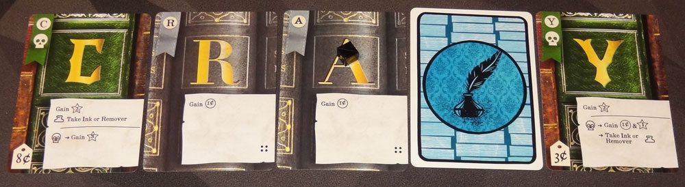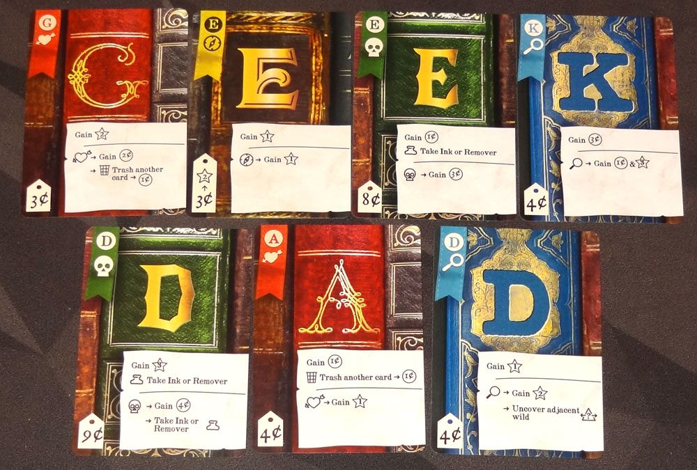 - Horror: Horror cards may allow you to take an ink or remover from the supply, and are the only way to obtain remover. Each remover token may be spent to remove an ink token from a card you’ve drawn, thus allowing you the option of leaving that letter out of your word. They also have some abilities that give you a choice between money and prestige.