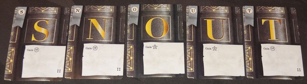 Finally, if you form a word with at least 7 letters, you may have a chance at a bestseller. Essentially when you make a long word, you get to take the Bestseller card for that word length. But no resting on your laurels: anyone who makes a word of that length gets to steal that card from you (hey, it’s the cult of the new). In addition, any of the Bestseller cards for shorter lengths are removed from the game. So to get the Bestseller, you must match or exceed the current record for word length. These points are only scored at the end of the game, so do not move your scoring marker at this time.