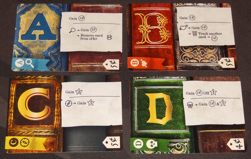 The game is mostly cards (as you’d expect from a deck-building game), and in this case each card is a letter of the alphabet. They’re made to look like letters printed on the spine of a book, with a scrap of paper showing the card’s effect. each card also has the letter in an index in the top left corner, made to look like a bookmark. Your starting cards are plain grey spines, but there are also four “genres” that have more colorful spines, along with icons representing the genres.