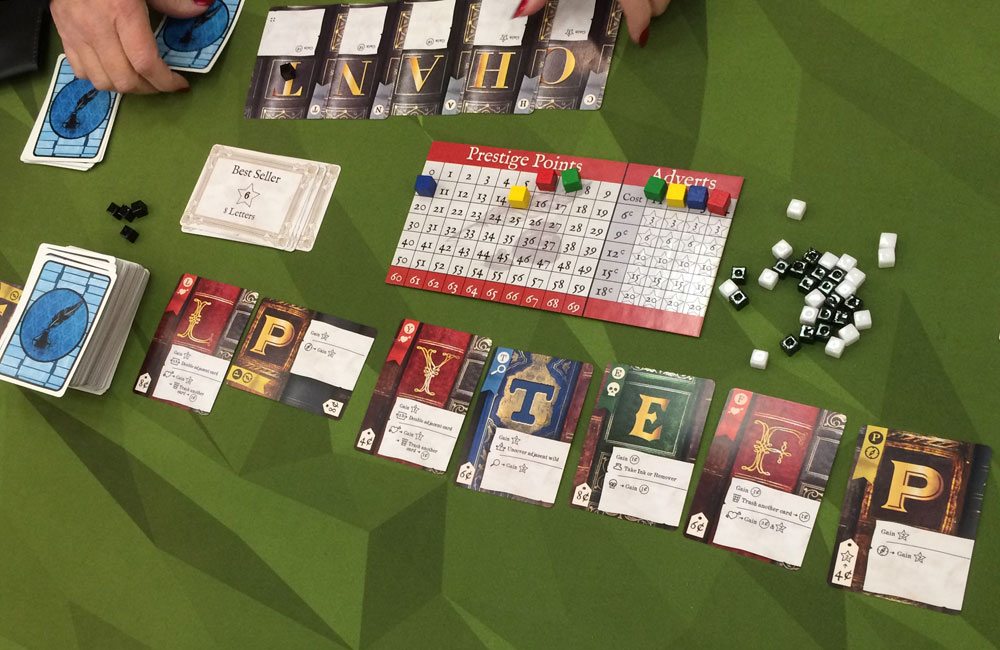 Take, for instance, the ink tokens and the press-your-luck element. Buying ink and spending it as money isn’t entirely a new concept—there are other games in which you can pay now in order to have more money to spend on a future turn, though in this case it’s a single use. But using ink to draw more cards is extremely powerful. It’s a good way to get those matching genre cards into play in the same word, and it’s also the only way to write a bestseller. Unlike most deck-building games, in Hardback there are no card effects that let you draw cards, so the only way to get more than 5 cards in your hand is to use ink. (Technically you could create a word with more than 5 letters if there are a lot of persistent letters on the table, but that’s not something you can control yourself.) I like that letters drawn with ink must be used in your word, making it possible to “bust” and lose your turn. However, since any letter from your initial 5-card hand can be turned into a wild, busting isn’t too common (unless you’ve bought a pile of Qs). Chances are that you will be able to spell a word; it just might not be the word you want.