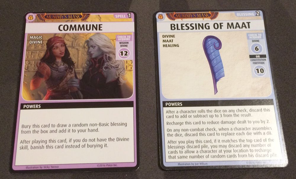 We did have a nice bit of luck: in one of Tup’s combats, he banished a spell to throw fire, which let him draw a random spell. He got Commune, which can be banished to get a random blessing: the Blessing of Maat. It’s a very powerful blessing with several different uses, including adding up to 3 to a roll, or changing all dice for a check to d8s. It’s the new blessing for Deck 2, and is typically a bit more difficult to acquire, so we totally lucked out on that one.