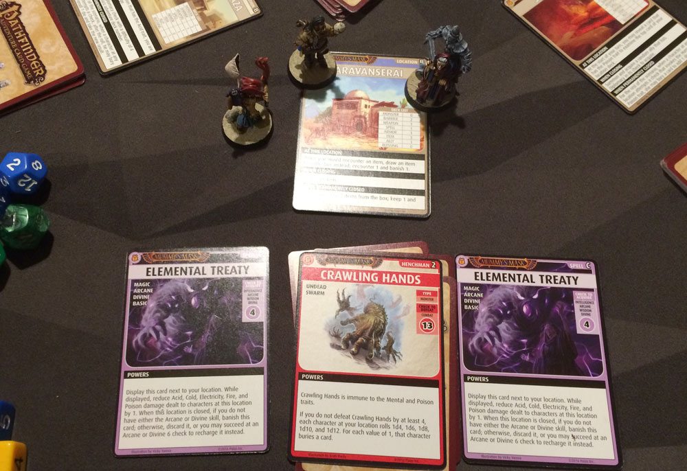 Oh, look! It’s another bad guy in a mysterious mask, this time a necromancer who’s been lurking in the Pharasmin tombs. This one is a more normal scenario—we just need to find and trap the villain. Two special rules apply: all Undead monsters are a little harder to defeat, and if we fail at any barriers, we have to summon and encounter the Crawling Hands henchman. (And there were a lot of barriers.)