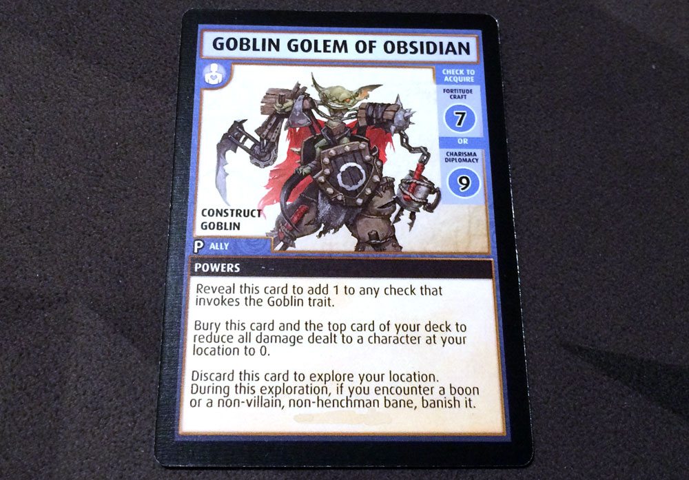 Yoon started off at the Canny Jackal, and used a Blessing of Nethys to peek at the top two cards. One was the Goblin Golem of Obsidian—a promo ally card I’d gotten with Deck 2, which is basically Ranzak in a mech suit. The other card was the Crawling Hands henchman, so we got our first look at it then. She put the Golem on top (and acquired it) and the Crawling Hands next. The Crawling Hands aren’t too hard to defeat, but you have to beat them by at least 4 or you risk burying cards: everyone at the location would have to roll a d4, d6, d8, d10, and d12, and then bury a card for each 1 rolled. Ouch! We wanted to avoid that as much as possible, so we threw blessings at Yoon. She defeated the Crawling Hands, but since they don’t allow you to close the location, she just stayed there to continue exploring.