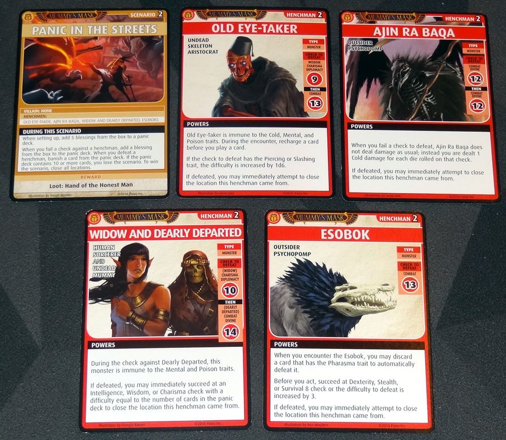 In this scenario, there’s no villain, and you must close all of the locations. But there’s a catch: you also have a “panic deck” that starts with 5 blessings in it. If you fail a check against a henchman, you add a blessing to the panic deck. If you defeat a henchman, you banish a blessing from it. If the panic deck reaches 10 cards, you lose.