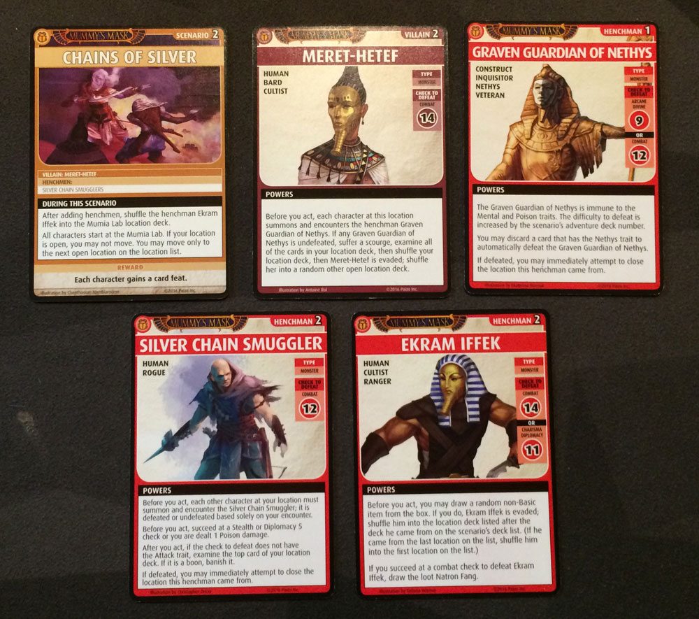 This scenario has 1 fewer location than usual, but you must start at the Mumia Lab, and may only move when your current location is closed. The Mumia Lab has an extra henchman shuffled in: Ekram Iffek. Also, when you move, you may only move to the next open location on the list. We wondered how many times we’d encounter the villain along the way, since we wouldn’t be able to spread out to temporarily close locations.