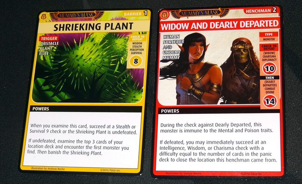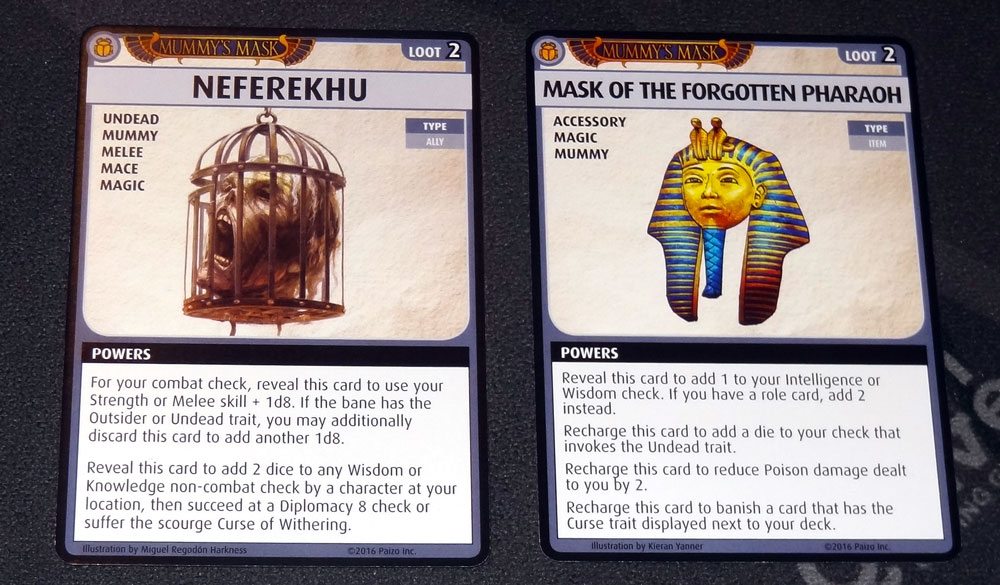 Our loot for the scenario was two cards: Neferekhu and the Mask of the Forgotten Pharaoh. Neferekhu is, from the looks of it, an undead mummy’s head in a cage—and it’s an ally! But it’s also a melee weapon that’s particularly good against Outsider and Undead. It can also boost non-combat Wisdom or Knowledge, but then if you can’t talk Neferekhu down, you suffer the Curse of Withering. Ahmotep didn’t really care for it because she really likes staff weapons when possible—plus it was unlikely she’d make a Diplomacy 8 check for the second bonus.