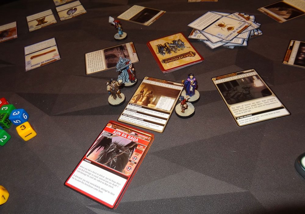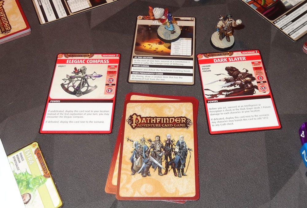 Since we didn’t have to worry about covering locations, we grouped up for this scenario a little, too. Tup found the Compass at the Mumia Lab, but didn’t have enough Intelligence/Craft/Disable to defeat it, so it just sat next to the location deck. He kept exploring, and ran into the Dark Slayer henchman (of which there were several in the scenario). The Dark Slayer first does Poison damage to everyone else if you can’t pass an Intelligence/Perception check (“You’re not paying attention? I’m stabbing your friend here!”), and then can be defeated with Wisdom/Charisma/Diplomacy 8 or Combat 11. That’s not actually that hard, and Tup has Charisma oozing out his ears… but missed by 1. Oh, well, back into the Mumia Lab he goes.