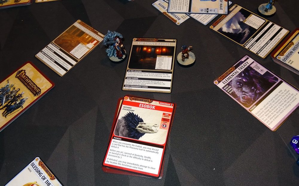 The Esoboks are the psychopomp spirits and, well, they are creepy. It looks like an alligator skull attached to a lion-like body, with a feathered ruff like a vulture. You can defeat one automatically by discarding a Pharasma card—otherwise, you have to pass a Dexterity/Stealth/Survival check or it gets harder to defeat. Failing this check, of course, also adds to the panic deck. Estra had spotted the Esobok while examining the deck, and left it for Yoon (who has good Dexterity and Stealth) to fight. Yoon defeated it, but then failed to acquire the top card of the blessings deck to close the Shiny Bauble… so we were going to have to plow through the rest of the deck.