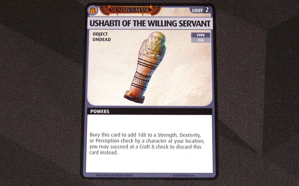 Our loot for this scenario was the Ubashti of the Willing Servant, a little object that can be buried to add 1d8 to Strength, Dexterity, or Perception. If you have Craft, you could potentially discard it instead of burying it. None of us were really keen on getting rid of any of our current items for this one, so it went back into the box with the other items.