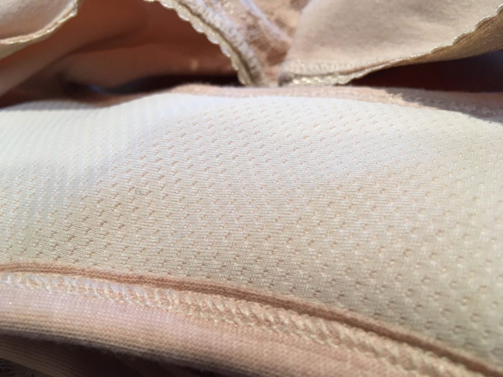 After hand washing them again and letting them dry, I tried a capacity test. The Level 1 undies didn’t quite hold 1/4 cup of water, but since they’re only supposed to hold two tablespoons, I thought they did remarkably well. The Level 3 undies easily held 1/2 cup of water. It took some doing for the undies to absorb the water, though, needing some pressure on the gusset while I was pouring. This didn’t happen when I was wearing them, however, and thus I chock that weirdness up to my procedure. While holding onto all of this water, both pairs of undies were still completely dry on the outside. I was amazed, but they worked, performing admirably in that department. On the other hand, when they were at capacity, the water easily squished back out of the inside, the side that would be against your body. This would end up squishing out the sides and on to your clothes, if you were wearing them at the time. So, while they take in as much liquid as advertised, I don’t think I’d trust them to hold onto it all.