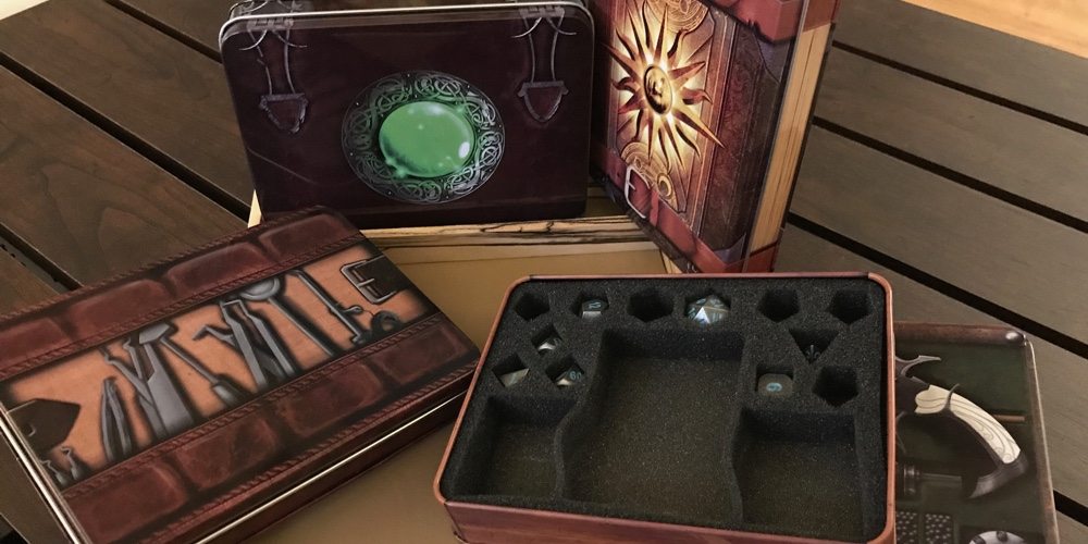 For just $20, you get a tin case that has been decoed to represent the gear your character would be walking around with in-game. Just like the Warlock’s Spellbook, the print on the case is durable and will take a beating. Inside the case is a special foam insert that has more than enough room for a full set of RPG dice plus a few extras. Where with the Warlock’s Spellbook the insert only had room for dice, these new models are much improved, with room for your character minis and small cards.