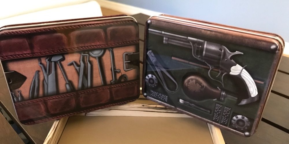 Skullsplitter Dice is at it again. I covered the company last year as part of my Stranger Things costume ideas. They had sent over a set of their impressively hefty metal dice and a Warlock’s Spellbook dice case. Now they’re raising funds on Kickstarter for a whole new line of “Daring Adventurers” dice cases: the Thieve’s Tools, Wizard’s Grimoire, Cleric’s Prayer Book, and Gunslinger’s Kit.