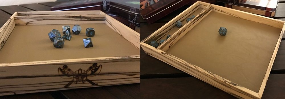In the meantime, if you want some new Skullsplitter Dice merch but don’t want to wait, you can grab one of their new wood and leather dice trays right now. Crafted locally in St. Petersburg (right up the road from me!), they feature sustainably harvested local woods: Spalted Chinaberry, Spalted Holly, and Rosewood. All have a leather rolling surface–essential when you’re chucking a set of their dice at the table. When you’re not rolling them, you can keep your dice in reserve in a section separated out for that purpose. They’re hefty pieces and look great on the table. They aren’t quite up to the “furniture finish” quality of my favorite wood RPG gear from Wyrmwood, but, for a first offering, they’re certainly impressive. The rolling trays start at $55, and you can pick them up directly from the site. If you’re looking for dice, you can get them from the site, or browse their selection on Amazon.
