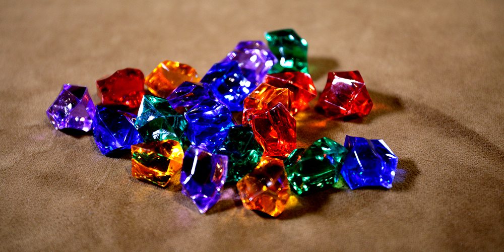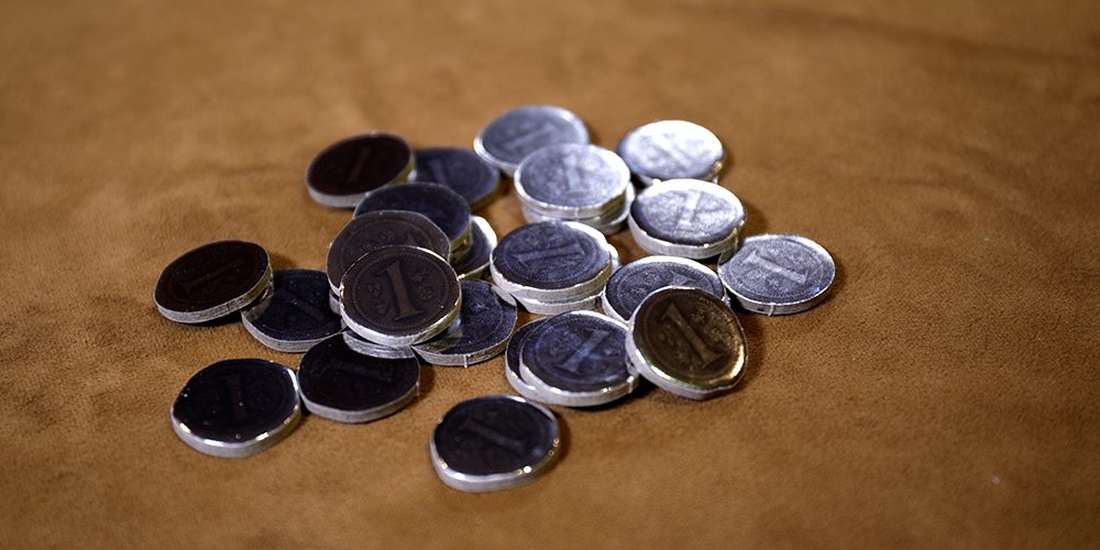 The Edict Deck Cover Card and the coins are foil-printed paper on cardboard. They are very shiny and really, really nice. While it’s just cardboard, it really increases the feeling of playing for money. Speaking of cash, the gems are pretty cool too. They all appear to be the same shape and are about the size of a d20, but a bit bigger when you account for its odd shape. They are in four different colors, which can be a bit misleading to new players, who assume they are different denominations or each color belongs to a different player.