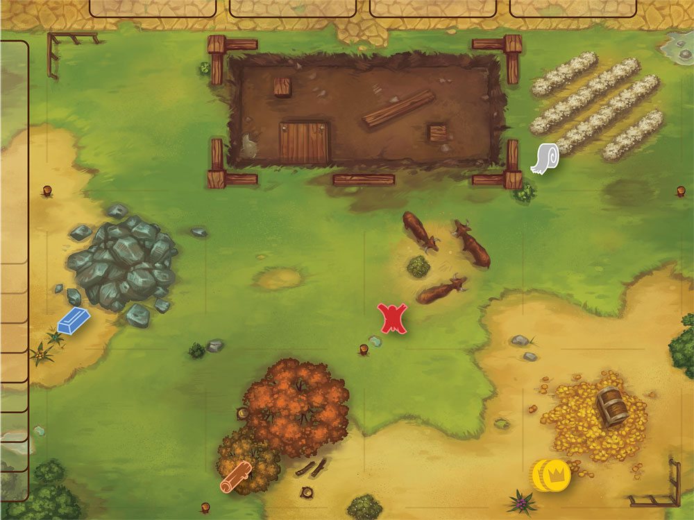The object of the game is to have the most points by the time the King arrives at the end of the second age—you earn points by helping heroes complete quests, collecting certain types of treasures, hiring workers, and by adding to your guildhall.