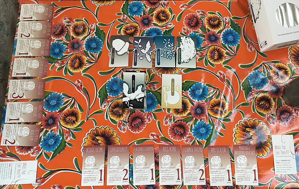 Hunter cards can be shuffled in with the Critter cards, and if a player has one, it can be used at anytime to ask a question during an answer about any Observant Owl card, even if that thing wasn’t mentioned. This is a potential way to both score more points and extend the chain of discussion.