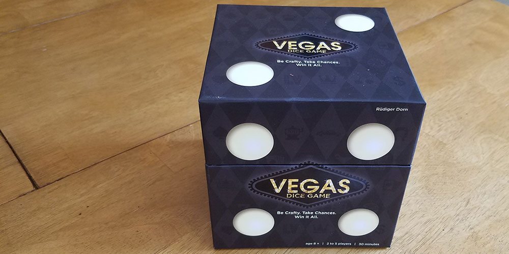 Vegas is a new, Target-exclusive version of Las Vegas, which was originally published in 2012. The basic gameplay remains the same, though the dice-shaped box is new to this version and the artwork has been changed somewhat.