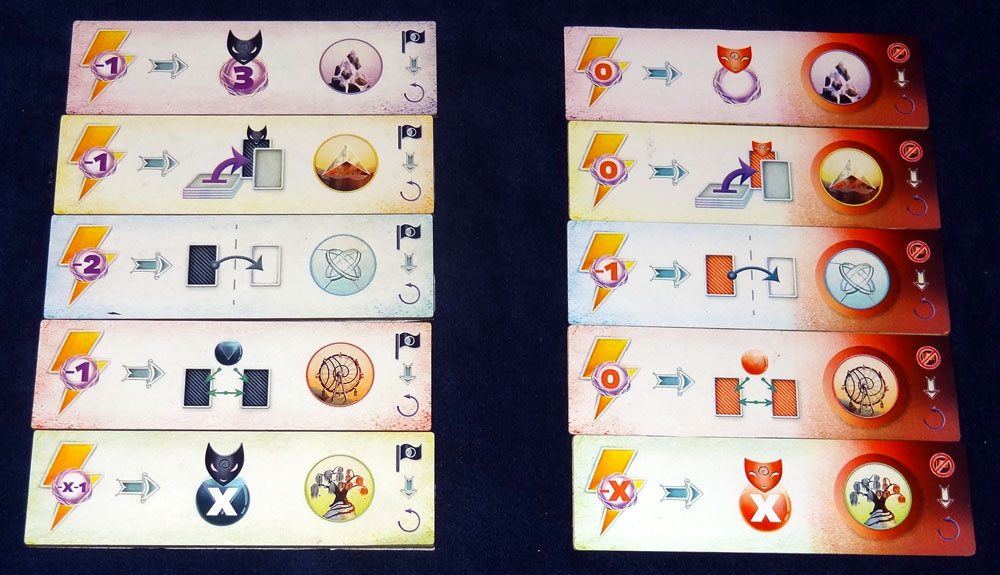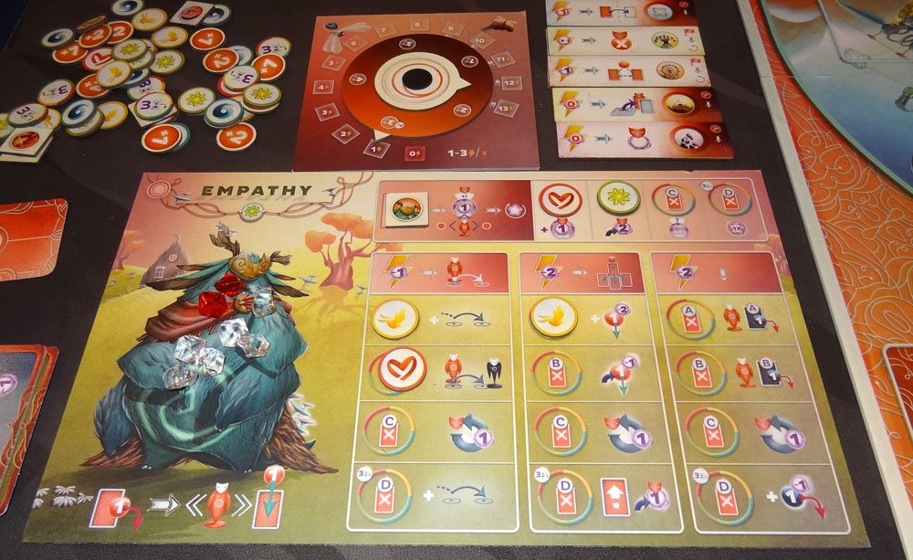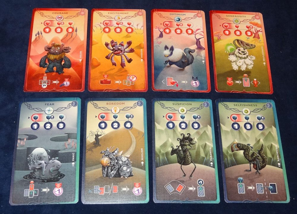 The emotions have mild and strong versions, though you won’t have strong versions of all of your emotions available in every game. As you place more essence on an emotion card, the intensity (represented by the numbers in the circle) may change, which then affects control over realms and frontiers. If there is ever no essence left on an emotion, the emotion is removed from the board and discarded.
