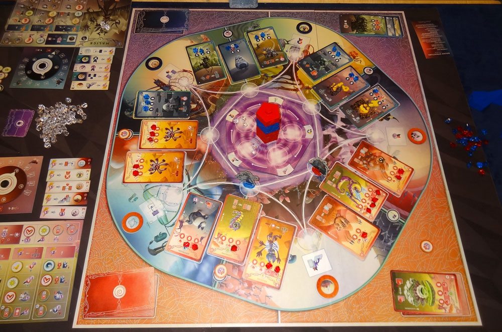 The board goes in the center of the table, with Bliss players on one side and Gloom players on the other side. The center of the board has a rotating pentagon called the origin, with five spheres on the corners. Place 5 willpower in each of these spheres. Flip one of the common aspiration cards face-up. Each team also draws one of their team aspiration cards and looks at it secretly. If it matches the common aspiration, draw a new one and shuffle the matching one back into the deck.