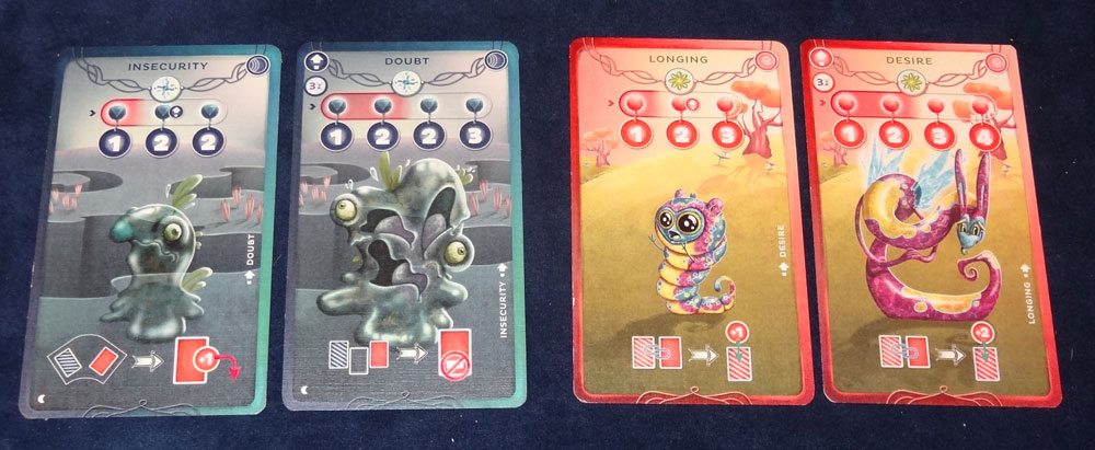 The artwork in the game is colorful and whimsical, with various creatures representing the various emotions like Dignity and Boredom and Jealousy. The game itself is mostly language-independent: there is no text on any of the boards or cards except the names of the emotions, and everything else relies on icons. However, that does mean that you maybe referring to the rulebook a lot when you’re getting started, because not all of the icons seemed very intuitive to me.