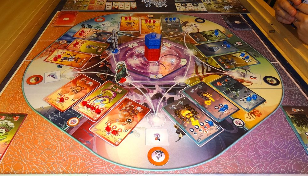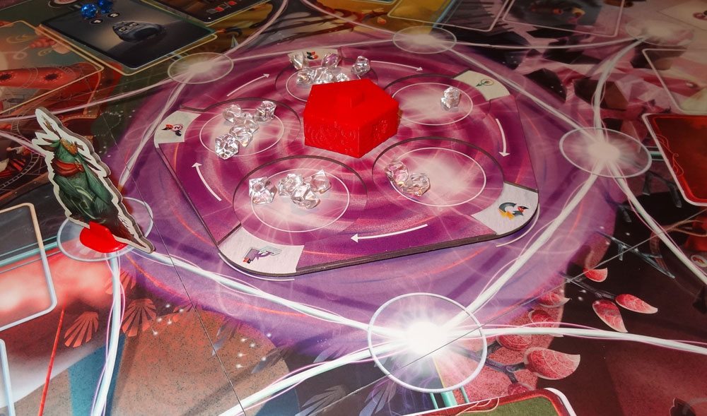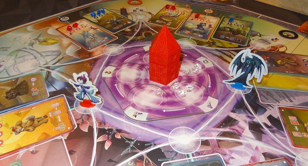 The identity fragments are plastic pentagons that stack on each other in the center of the main board: blue for Gloom and red for Bliss. They form a column in the center of the board, and there are minor and major versions. The major fragments are thicker, and have some symbols on the faces, including one extruded symbol that marks which direction the fragment is facing. The top piece is used at the end of the game, potentially capping off the tower for one of the teams. The pieces pictured here are prototypes only, but give you a good idea of how they will function.